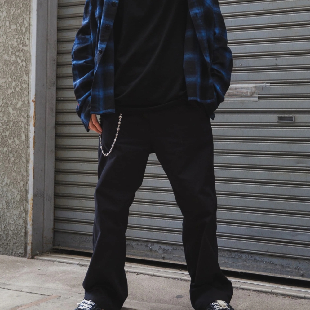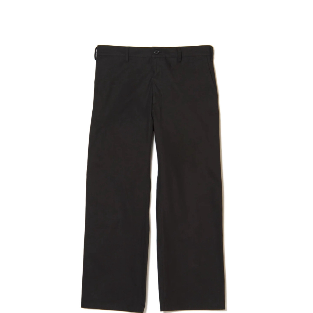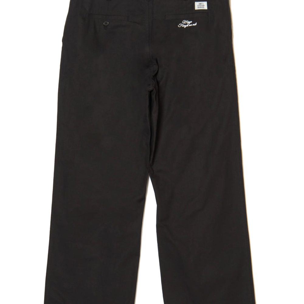 バックにロゴ刺繍とピスネームをつけたストレートタイプのシルエットの美しいシンプルなチノパンツ。