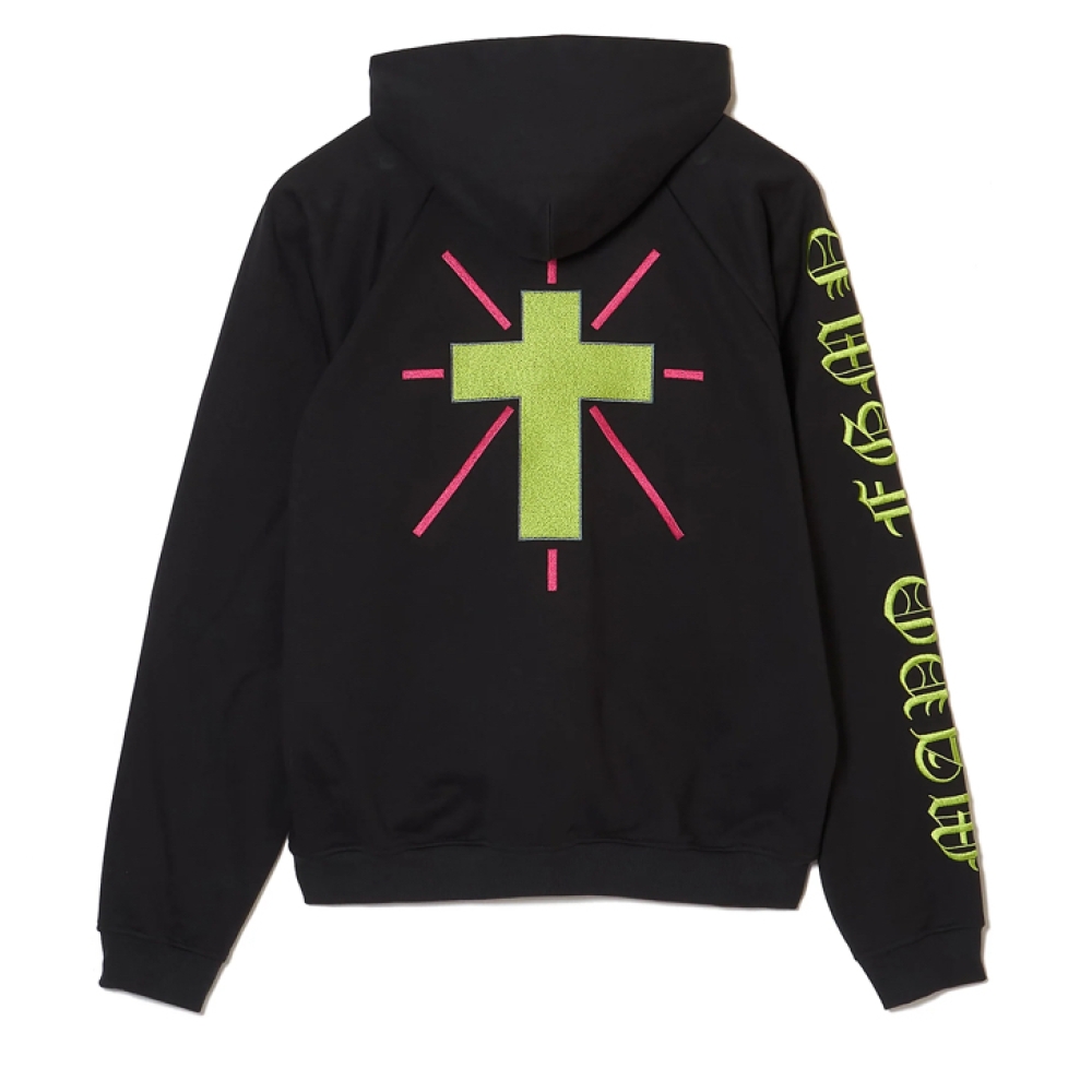 フロントに大きく施されたジーザス刺繍とバックにクロスの刺繍、片方の袖に刺繍の入ったラグラン袖のフーディになります。