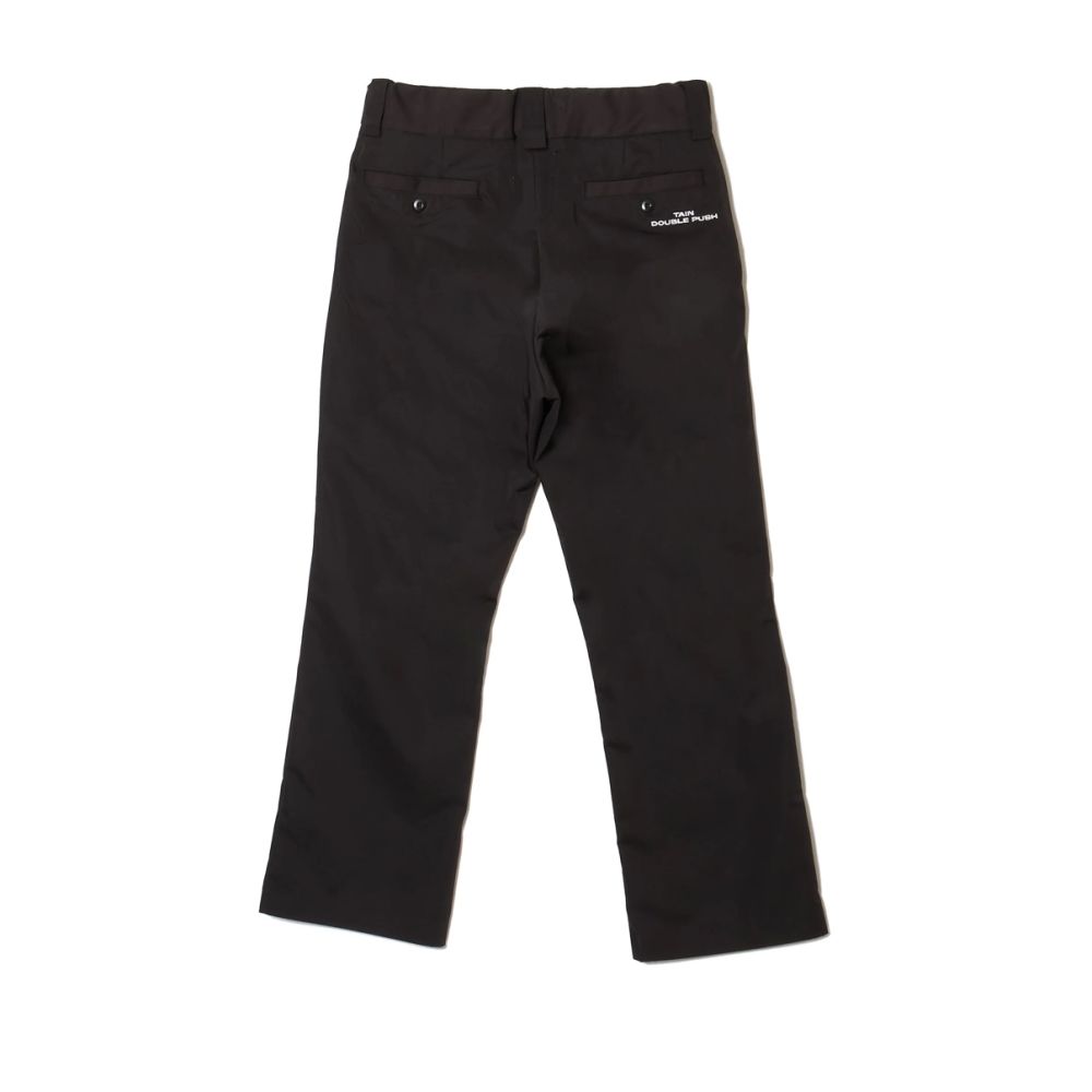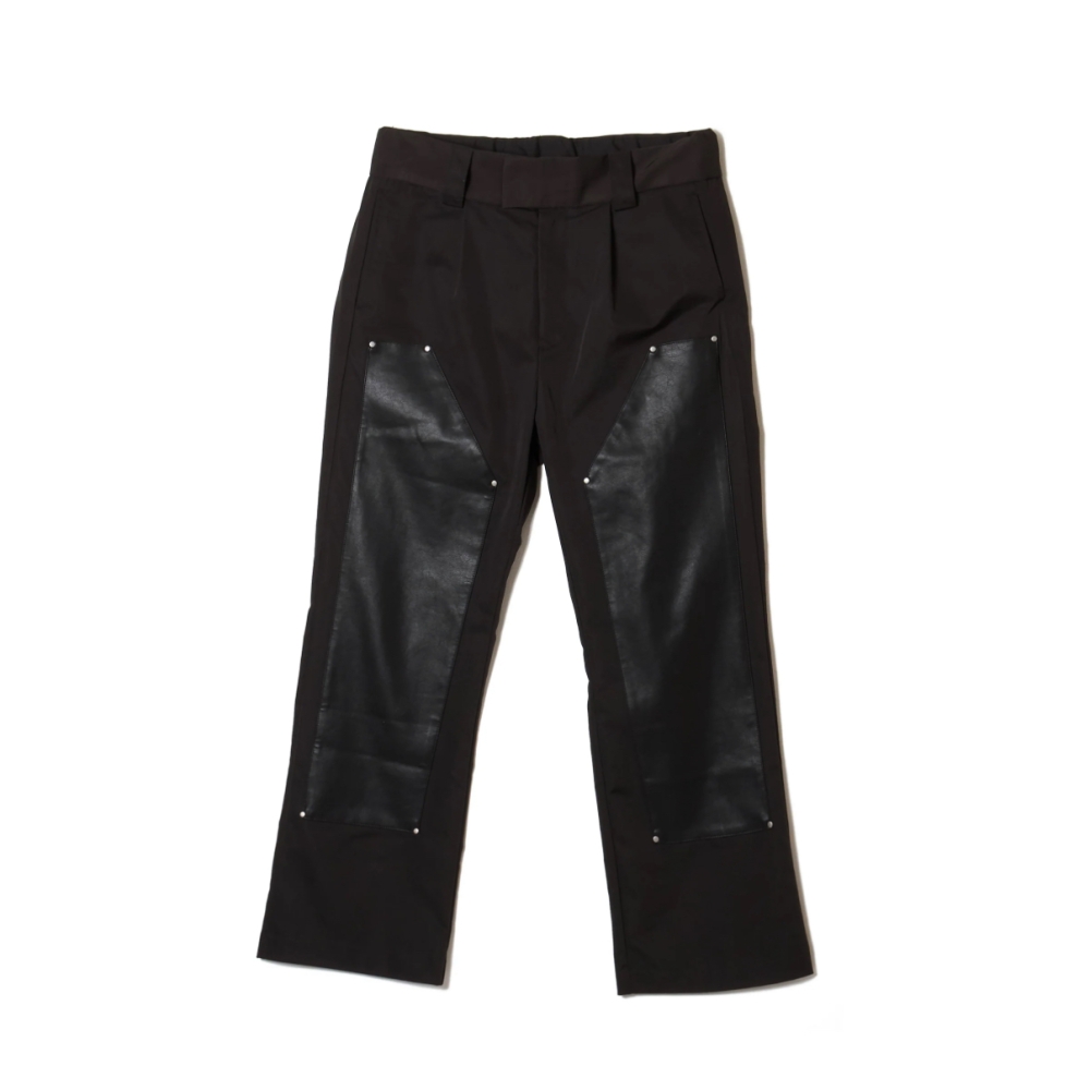 微光沢のあるツイル生地にエコレザーを使用したダブルニーパンツ。